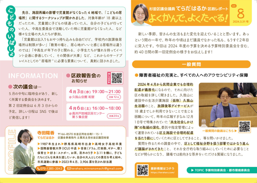 一般質問や、予算特別委員会の質疑の内容、都市環境委員会のご報告、「こどもの居場所」に関するワークショップの様子など、ぜひ確認してみてください。
