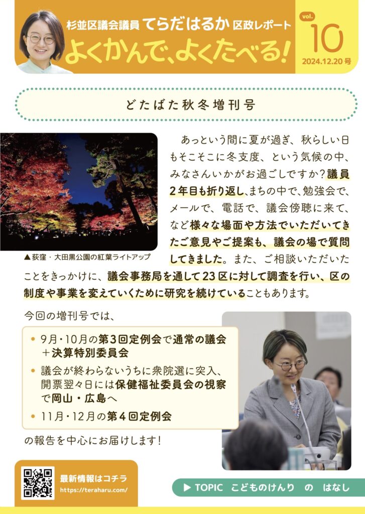 今号では、『どたばた秋冬増刊号』ということで、9月10月の第3回定例会、衆院選、岡山・広島への保健福祉委員会の視察、11月12月の第4回定例会など、2024年秋冬のさまざまなことがらについて書いています。また、「こどものけんりのはなし」として、子供の権利と杉並区の取り組みをまとめています。ぜひチェックしてみてください。