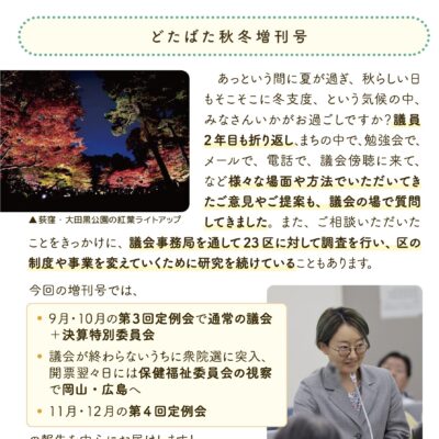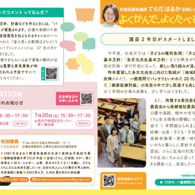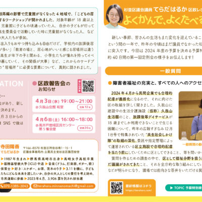 『よくかんで、よくたべる!てらだはるか通信』のvol.10を発行しました。 今号では、『どたばた秋冬増刊号』ということで、9月10月の第3回定例会、衆院選、岡山・広島への保健福祉委員会の視察、11月12月の第4回定例会など、2024年秋冬のさまざまなことがらについて書いています。また、「こどものけんりのはなし」として、子供の権利と杉並区の取り組みをまとめています。ぜひチェックしてみてください。