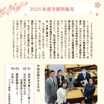 『よくかんで、よくたべる!てらだはるか通信』のvol.11を発行しました。 今号は『2025年度予算特集号』として、中面で来年度の予算についてくわしくまとめています。てらはるの注目予算や、予算特別委員会での質疑の内容など、ぜひ確認してみてください。また、谷川俊太郎さんが名誉区民になったことや、懲罰動議についても書いています。 議員2年目を終え、任期残り2年というタイミングの春。てらだはるか通信もた…